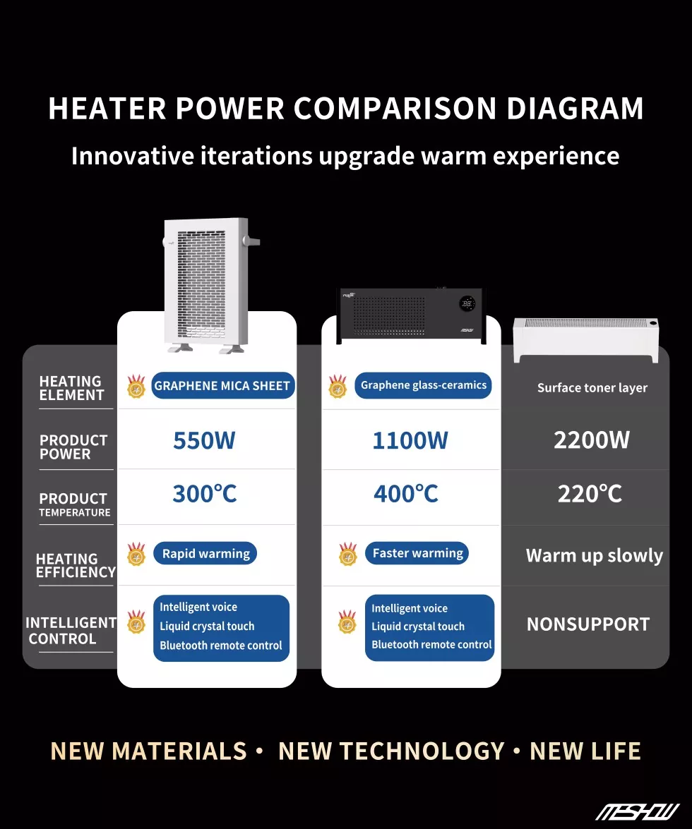 Meshow сприяє високоякісним вертикальним нагрівачам білого графену на вітчизняних та міжнародних ринках. Завдяки технології опалення графену та високою ефективністю та енергозбереженням, вона дуже віддає перевагу користувачам будинку та офісу та став кращим обладнанням для опалення. Нагрівач виготовлений з графенового матеріалу, який досягає швидкісного перетворення електричної енергії в теплову енергію з надвисокою теплопровідністю, що призводить до швидкого та рівномірного нагрівання. Його ефективний режим створює чудові енергозберігаючі ефекти, особливо підходить для холодних зимових сезонів, забезпечуючи постійне тепло.