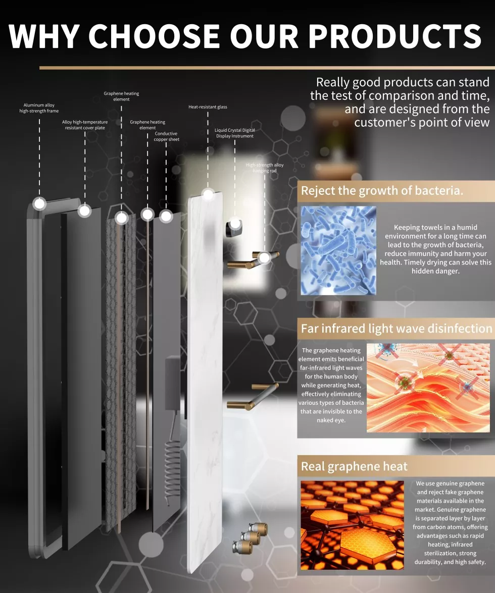 Як провідний виробник, Meshow запустив різноманітні популярні домашні продукти з чудовими технологіями та вишуканою майстерністю, серед яких 20 Вт-стійка для рушників графену є особливо привабливим. Цей продукт інтегрує передові технології та сучасну естетику, революціонуючи досвід домашнього життя. Використовуючи графен в якості основного нагрівального елемента, він досягає швидкого нагрівання завдяки своїй надвисокій теплопровідності. Після включення мокрі рушники можуть стати сухими протягом декількох хвилин, ефективно запобігаючи росту бактерій та забезпечуючи здоров'я членів сім'ї.